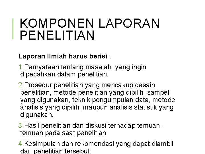 Menurut kandungan isinya, karya ilmiah dapat berbentuk laporan penelitian, artikel hasil penelitian, artikel gagasan konseptual, atau makalah. Kesimpulan pada laporan hasil penelitian berisi tentang hasil analisis yang telah dilakukan dan juga berisi tentang hasil pengetesan . Kesimpulan berisi jawaban atas pertanyaan yang diajukan pada bagian. Abstrak penelitian biasanya dibuat pada artikel atau makalah atau. Kesimpulan utama pada tulisan ilmiah dari hasil penelitian yang .