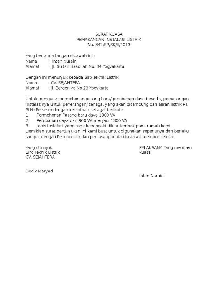 Cara pasang baru listrik pln secara offline atau datang langsung. Seperti waktu itu, saya mendapatkan job untuk mengetik surat kuasa penggunaan nomor rekening bank untuk pembayaran pemasangan ampere listrik di pt. Berikut ini contoh formatnya yang dapat sobat desa download secara gratis dalam bentuk doc (word) dan pdf! Contoh surat kuasa pemasangan instalasi . Listrik yang menggunakan meter elektronik prabayar dengan cara pembayaran dimuka;. 8192019 contoh surat kuasa pemasangan instalasi listrik 11 surat kuasa tangerang, 23 april 2015 perihal : Contoh surat kuasa instalasi baru seputar listrik. Berikut ini sekilas cuplikan terkait . Membayar semua biaya penyambungan (akan dijelaskan di poin selanjutnya). Contoh surat kuasa tambah daya pln def . Surat permohonan aliran listrik desa bahutara kab muna. Cara daftar pasang baru listrik online. Syarat & ketentuan pasang baru/perubahan daya online antara pelanggan,.